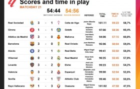 1月27日讯 数据显示,西甲第21轮没有任何一场比赛的净时间超过了60分钟,平均净时间为54分44秒...